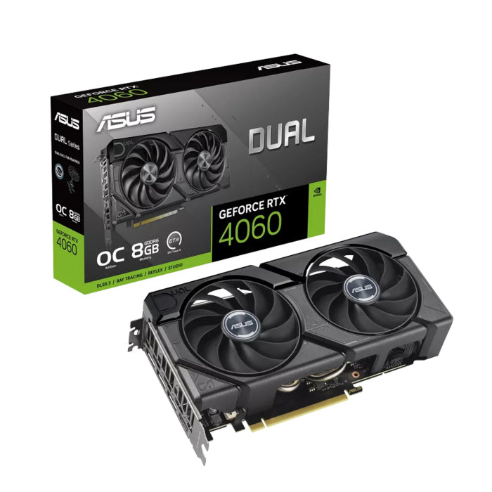 The ASUS Dual GeForce RTX 4060 EVO OC Edition 8GB GDDR6 (Model: DUAL-RTX4060-O8G-EVO) offers advanced graphics performance for gaming and content creation. Its compact 2.5-slot design ensures compatibility with various PC builds.